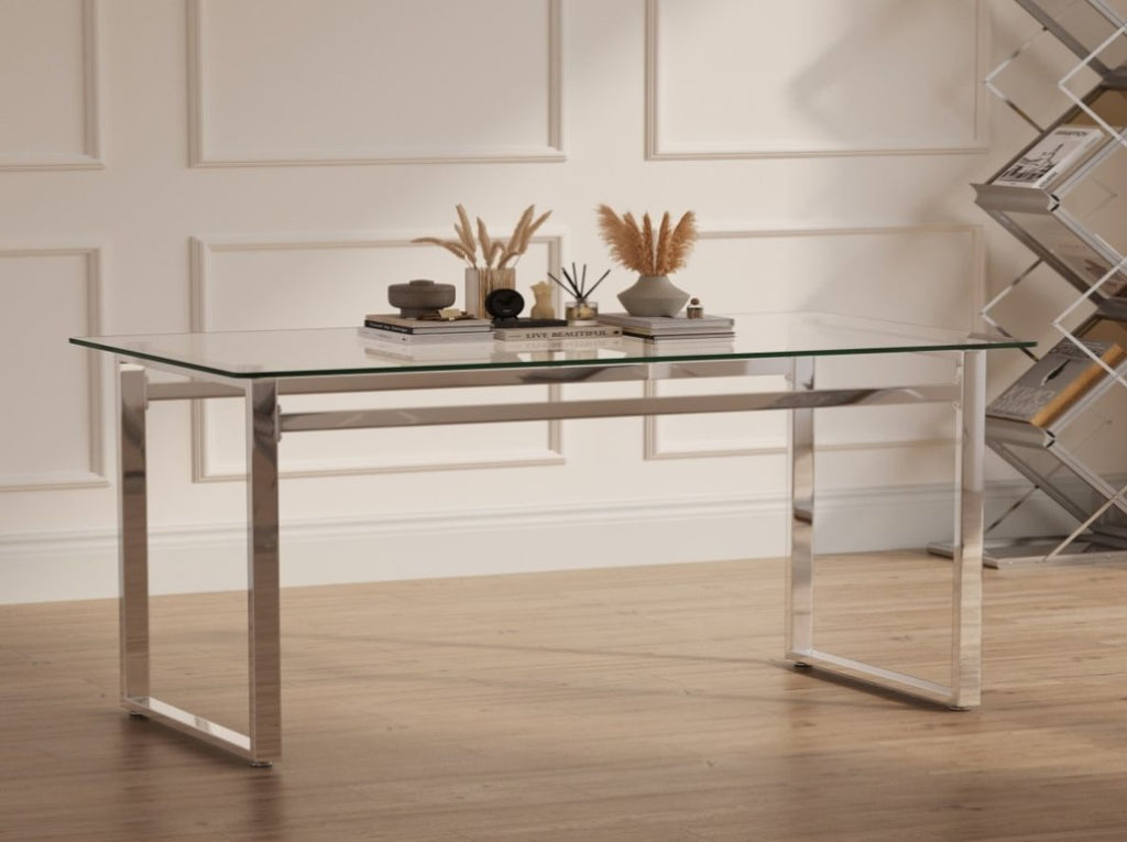 2.Glass Dining Table: Elevate your dining space with our glass dining table, boasting a sleek design with silver electroplated metal legs that seamlessly combine style and stability.