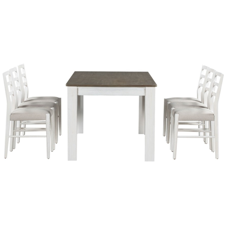 This set contains an adjustable table and six chairs with soft cushion. The unique two-tone color combines antique white and weathered brown finishes to create a look that matches many decor styles. This table can easily be expanded to accommodate 8 people. One table and six chairs are perfect for family dinners and friend gatherings. Whether enjoying an everyday meal with the family or hosting a dinner party, this seven-piece set is a must-have for your abode.
