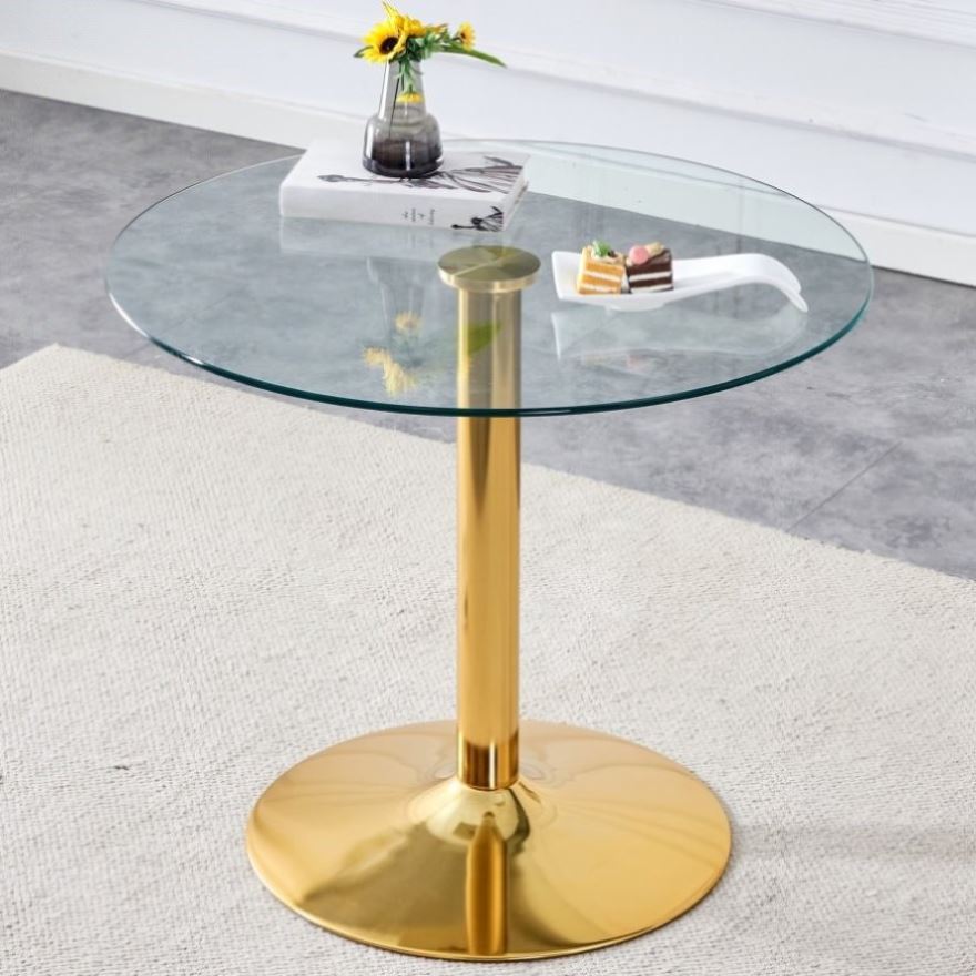 A 35-inch diameter glass top and a modern, minimalist round dining table with gold metal legs. Ideal W1151P263755