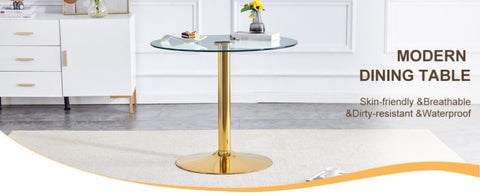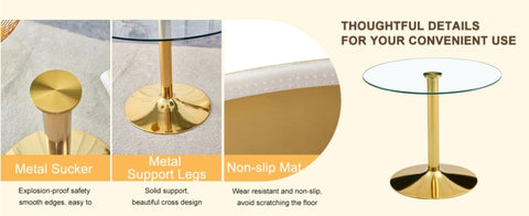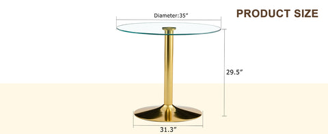 Spacious Table Top: The round table top with a diameter of 35 inches is made of transparent tempered glass with smooth edges, providing ample dining space suitable for family gatherings and social activities.Stable Support: The cylindrical legs are made of metal with a golden spray coating, paired with a round gold base, providing stable support with a maximum load capacity of 300 pounds.