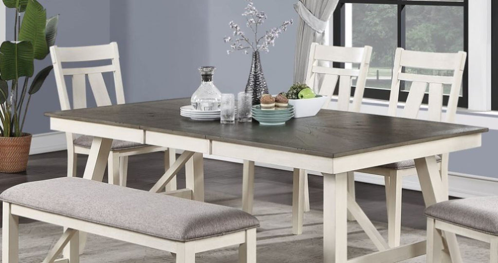 Fill your home with country living with this dining set that features seating for up to six guest. Its a casual vibe that sets the tone for an opportunity to enjoy a great meal with friends and family. A hue of gray wood finish is trimmed in white flows through the rectangular shaped table.