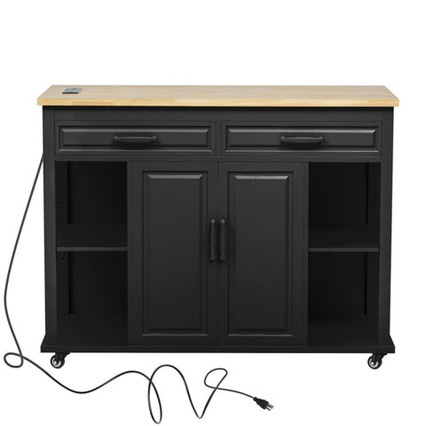 [Ample Storage Space] This Kitchen Island provides a combination of closed and open storage options, as well as a spacious 47.2 x 19.7" countertop. The rustic rubber wood veneer top creates a striking contrast with the rest of the frame's rich tone. With two drawers on top and four open compartments on the sides, this kitchen island offers ample space for organizing kitchen items. The island doors reveal three adjustable shelves, allowing for customizable interior storage based on needs.
