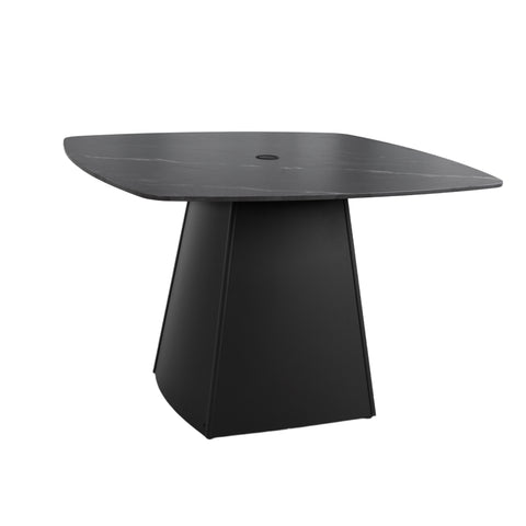 Elevate your outdoor dining with this 44"x44" Modern Rounded Square Table, designed to seat four comfortably. The black sintered stone tabletop features seamless white veining, offering a sleek yet durable surface that resists scratches and weather damage. A rust-free aluminum flared pyramid pedestal base ensures stability, while its Ember Black powder-coated finish enhances durability. With smooth edges, safety-rounded corners, and a 2" umbrella hole, this table blends elegance and functionality for any patio, poolside, or terrace setting.