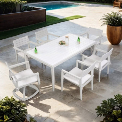 Transform your patio into a chic dining space with this modern two-tone outdoor table. The light-weight aluminum frame ensures easy movement and durability, while the tapered legs add a touch of elegance to the low-profile design. For safety and style, the table boasts a chic gray edge that complements the matte white finish and features safe, stylishly rounded corners. Non-slip, adjustable feet keep the table stable and protect your floor.