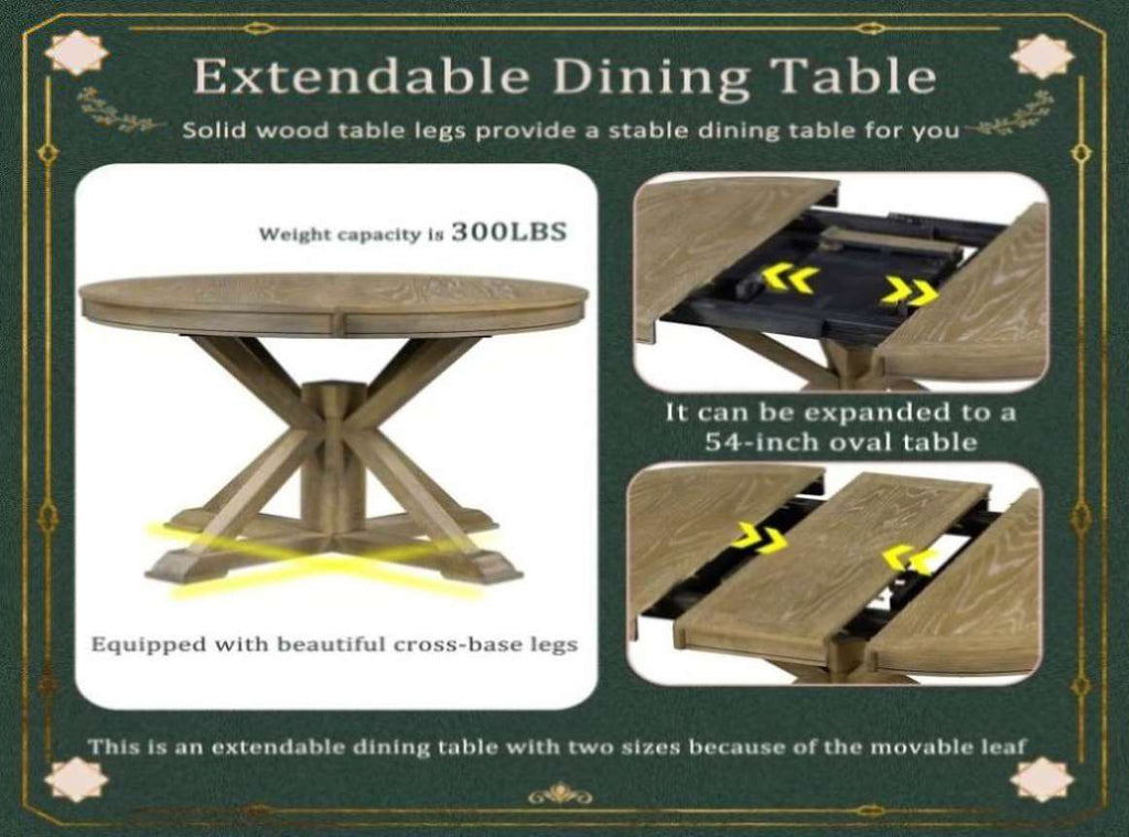Extendable Table Top: The dining table equipped with a lovely 12" butterfly leaf, which can help you adjust the table top from 42" to 54" according to the number of dinners, greatly seating up to 6 people. You just need to insert the self-storing leaf, and you can get an oval tabletop. If you want to change the tabletop to a round shape, you can enfold the butterfly leaf and then hide them beneath the tabletop.