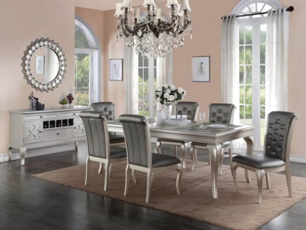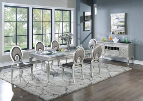Brighten your formal dining room with this Italian inspired design of majestic craftsmanship. This dining set is covered in a sateen finished silver hue with carved accents to enhance its beauty. This set includes a round table with seating for up to four. Each chair is trimmed in the silver with a darker gray hue of upholstered seat and back cushions.