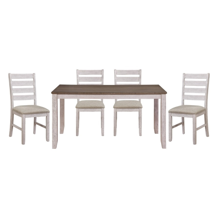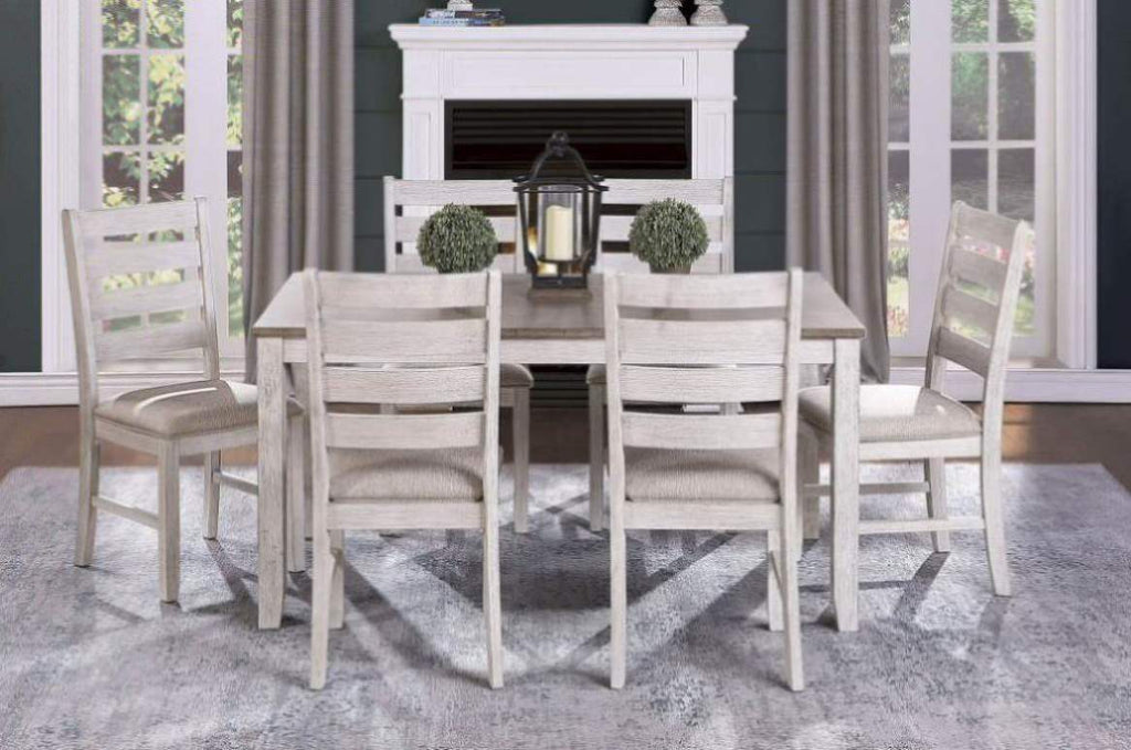 With a neutral palette and transitional design, the Ithaca Collection will place perfectly in your casual dining room. The fixed-top tables two-tone finish that graces the acacia veneer - the legs and apron a grayish-white supporting the medium brown top - creates a canvas for your decorative tabletop accessories.