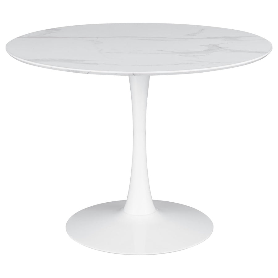 Compliments will keep coming when guests see this sleek round dining table. Designed to look like luxurious marble, it's sealed with a protective coat against spills and stains, ready to serve your next meal in style.