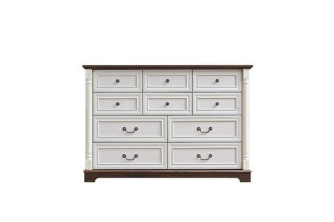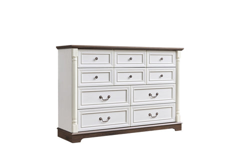 this 10-drawer dresser features an antique two-tone wood grain that stands out against the distressed finish, bringing warmth to your bedroom/living room. The wooden base and solid wood columns are adorned for a beautiful finish. Pair with unique antique tone pulls for years of satisfaction. Pair with the entire bedroom furniture collection