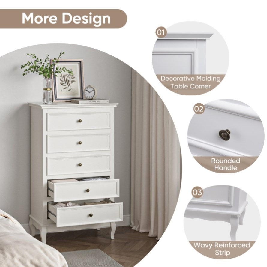 Enhanced Safety: This 5-drawer dresser is equipped with a decorative wave-shaped reinforcement bar underneath, improving both its visual appeal and stability. With a rear anti-tip design, it guarantees a safe and steady stance.
