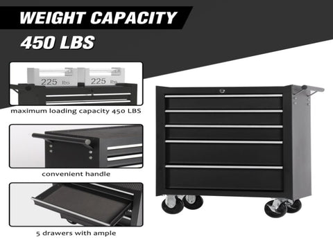 FAIR STORAGE SPACE: The rolling tool chest is designed with 5 drawers for storing tools, small equipment or other objects. And its top, with a cushion, can be used for placing tools during work as well.