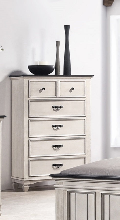 Description:- This dresser features detailed molding and vintage-inspired metal hardware, offering a luxurious additional to any bedroom. The gentle antique white palette is soothing to the eye, making the piece a perfect choice for creating a serene and sophisticated bedroom oasis. Adorned with black nickel hardware, this chest of drawers will perfectly adorn your room alongside any of the other matching pieces..