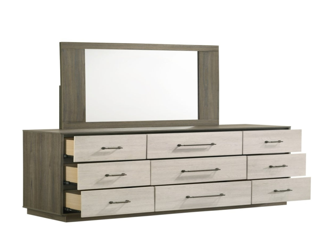 Enhance your bedroom with this modern dresser, meticulously crafted from a blend of solid and manufactured wood. The two-tone finish, combining a natural wood look with contrasting light-colored drawer fronts, offers a stylish and contemporary appearance. The dresser includes nine generously sized drawers, providing ample storage space for clothing, accessories, and more. Featuring smooth metal handles and easy-glide hardware, this dresser blends functionality with sleek design, making it an ideal addition to any bedroom.
