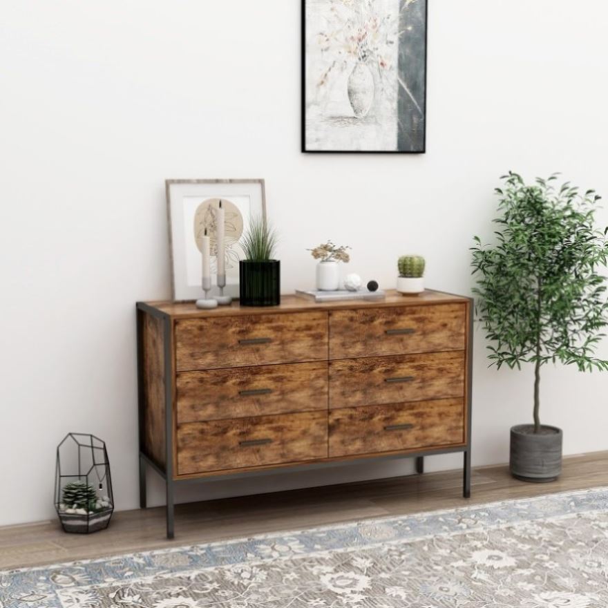 Industrial Style 6 Drawer Double Dresser,Rustic Brown Wood Storage Dresser Clothes Organizer with W141260283