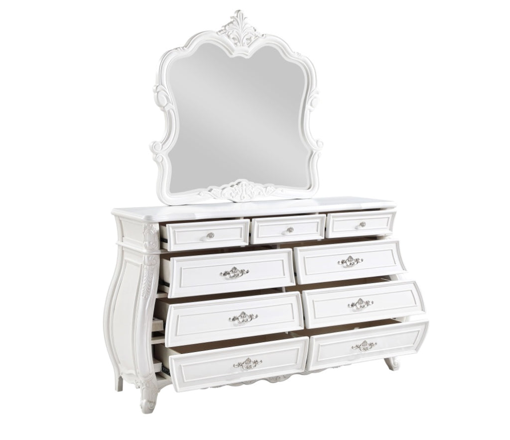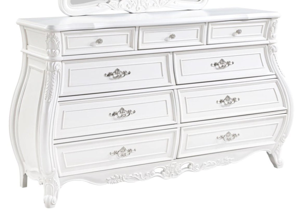 Bring timeless elegance to your bedroom with this exquisite dresser, crafted with intricate details and a smooth pearl finish. Its elegant curves and floral carvings on the drawers and sides give it a vintage, yet luxurious appeal. Offering ample storage, the dresser features multiple drawers, perfect for organizing your clothing and essentials. The combination of traditional craftsmanship and modern functionality makes this piece both stylish and practical, ideal for creating a refined bedroom environment.
