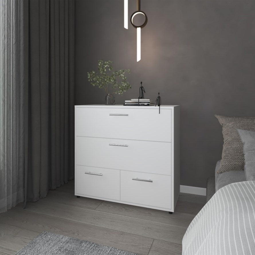 """Modern dresser of drawers featuring a practical design with two spacious large drawers and two smaller divided drawers, perfect for organizing clothing, linens, or accessories. Its sleek and minimalist aesthetic makes it a versatile addition to bedrooms, living rooms, or a baby’s nursery. The durable construction and smooth metal handles ensure long-lasting use and ease of access. Whether storing everyday essentials or special items, this chest offers a stylish and functional storage solution for any space.""
