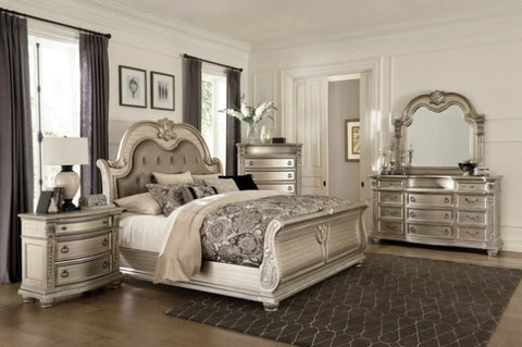 The Cavalier Collection exemplifies the finest in Old World European design inspiration. Egg and dart base moldings, bead molding, acanthus leaf carvings, and genuine marble inset top all blend to achieve an elegant addition for your traditional bedroom. The dresser’s beautiful details are accented by the silver finish on birch veneer.