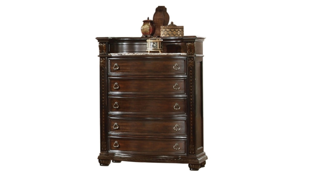 The 5-Drawer chest in this collection is a beautiful fusion of elegance and practicality. Its classic design is characterized by detailed carvings and a rich beige finish, aligning with the traditional theme of the set. It features multiple drawers, providing ample space for organizing personal items. The chest's top surface can be used to display decorative pieces, adding a personal touch to your bedroom. This piece not only offers storage solutions but also enhances the overall aesthetic of your space.