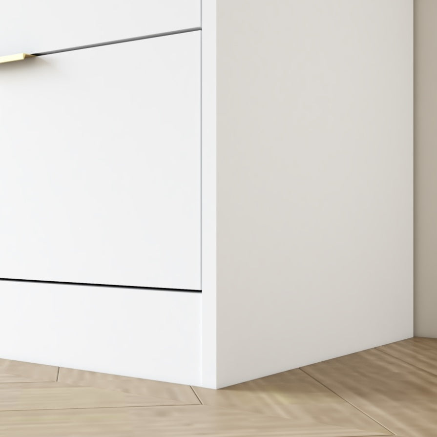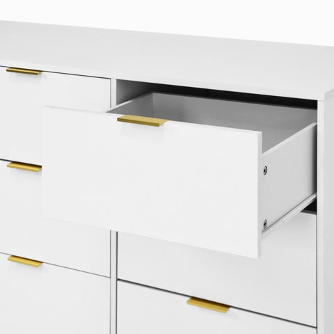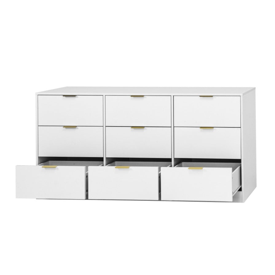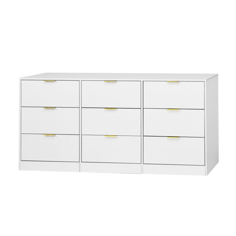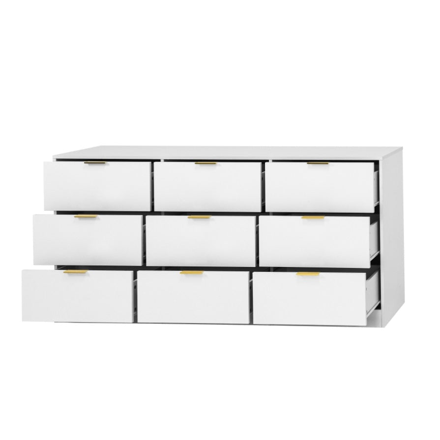 Modern 9 Drawer Dressers: This large white chest of drawers with golden handles has a classic, simple design fit well in any decor style, creating a spacious and versatile look for your room
