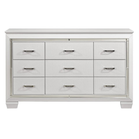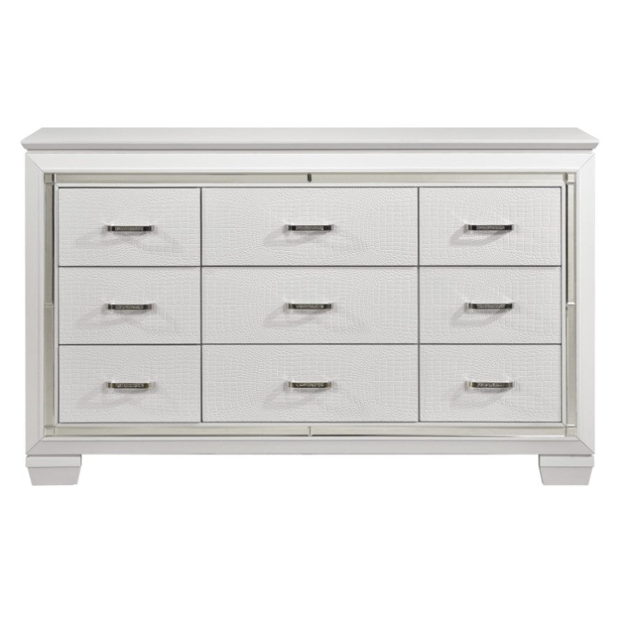 Glamour reigns in the design of the Allura Collection. Alligator embossing and high polished crystal-enhanced hardware boldly accent the white finish of the dresser.