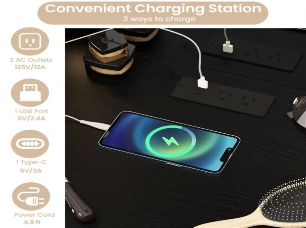 • Convenient Charging Station: Built with 2 125V/12A AC outlets, 1 5V/2.4A USB port and 1 5V/3A Type-C interface, this vanity table set offers 3 ways to charge for your beauty tools or other devices. Besides, with a 6cm/2.5" hole at the back, you don't have to worry about messy cords.