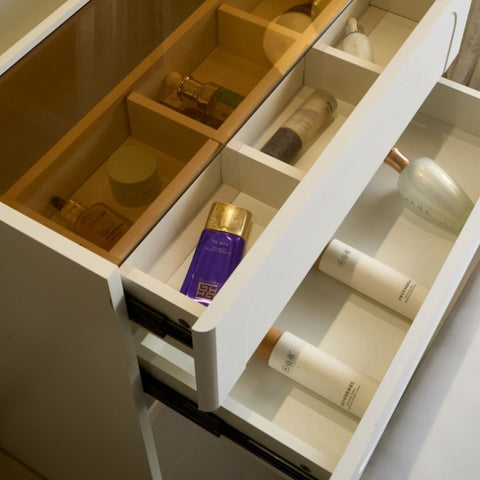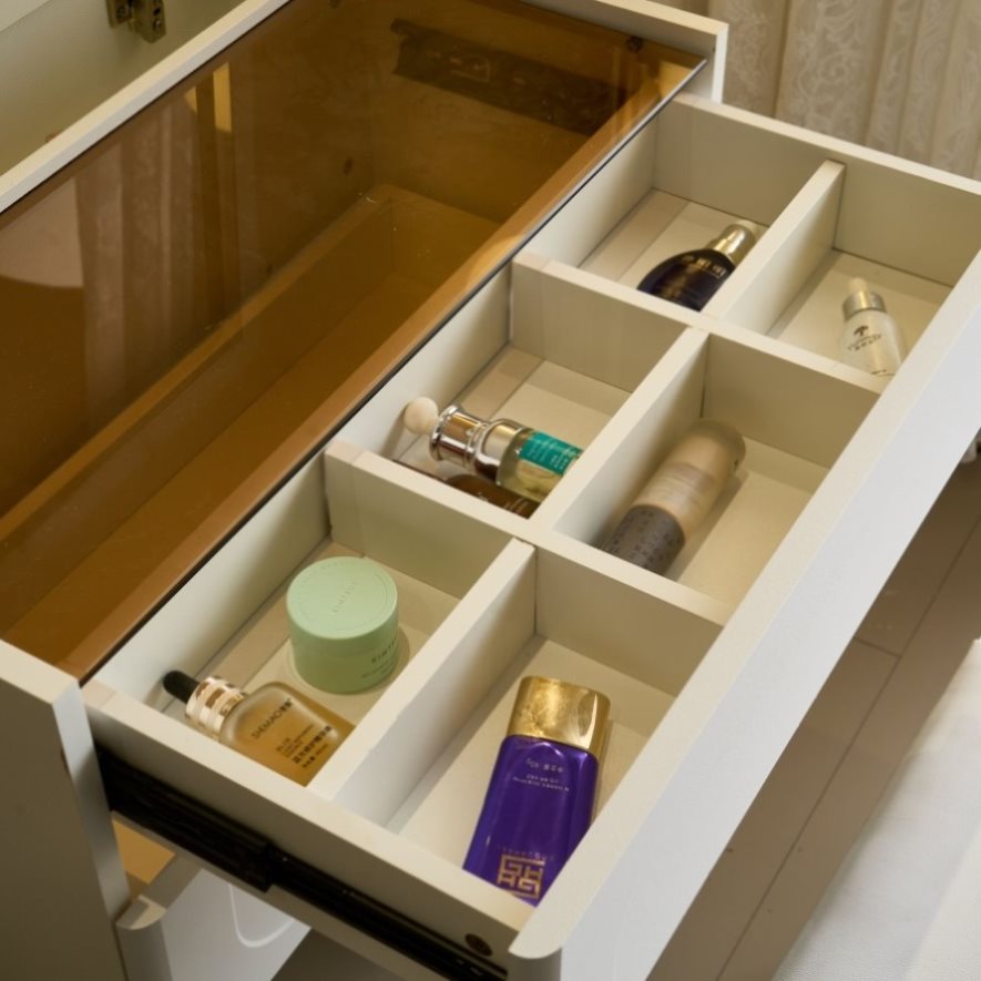 Visual Desktop: The top tabletop drawer is designed with 6 separate compartments where you can select your makeup and jewelry through the clear tempered glass top