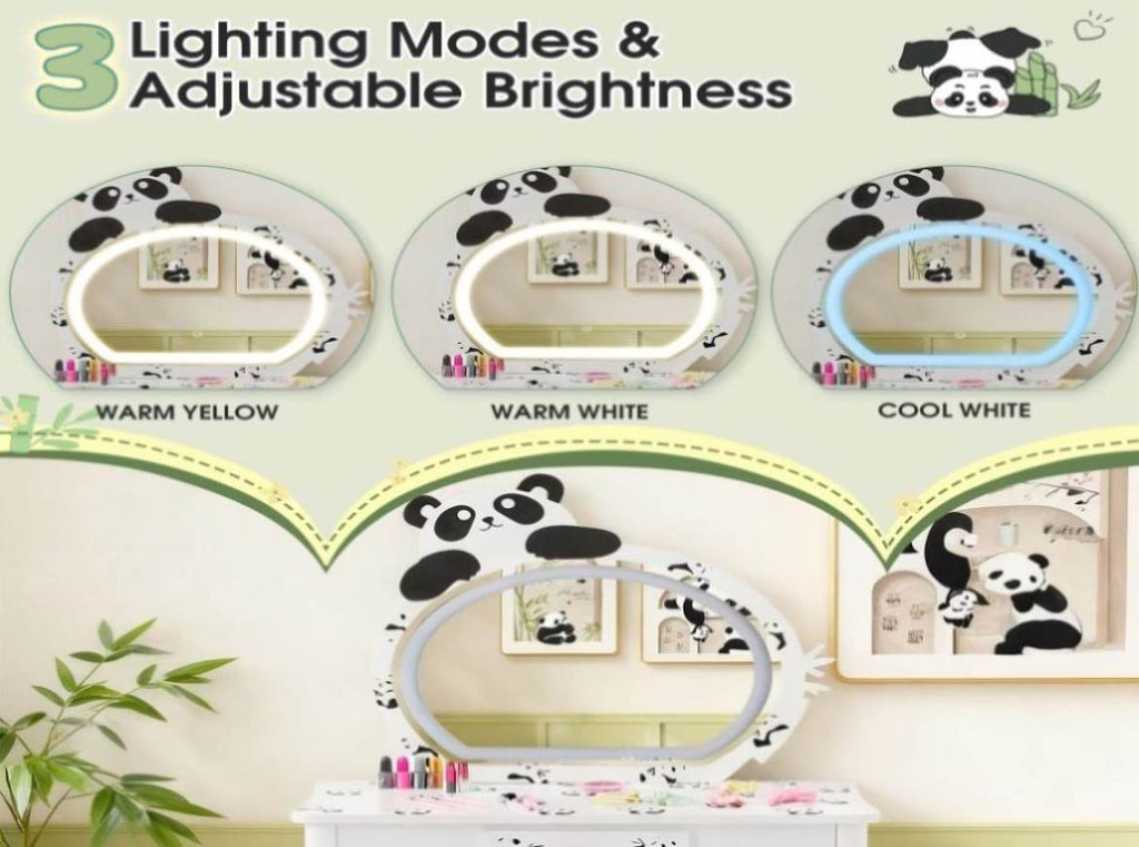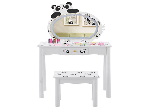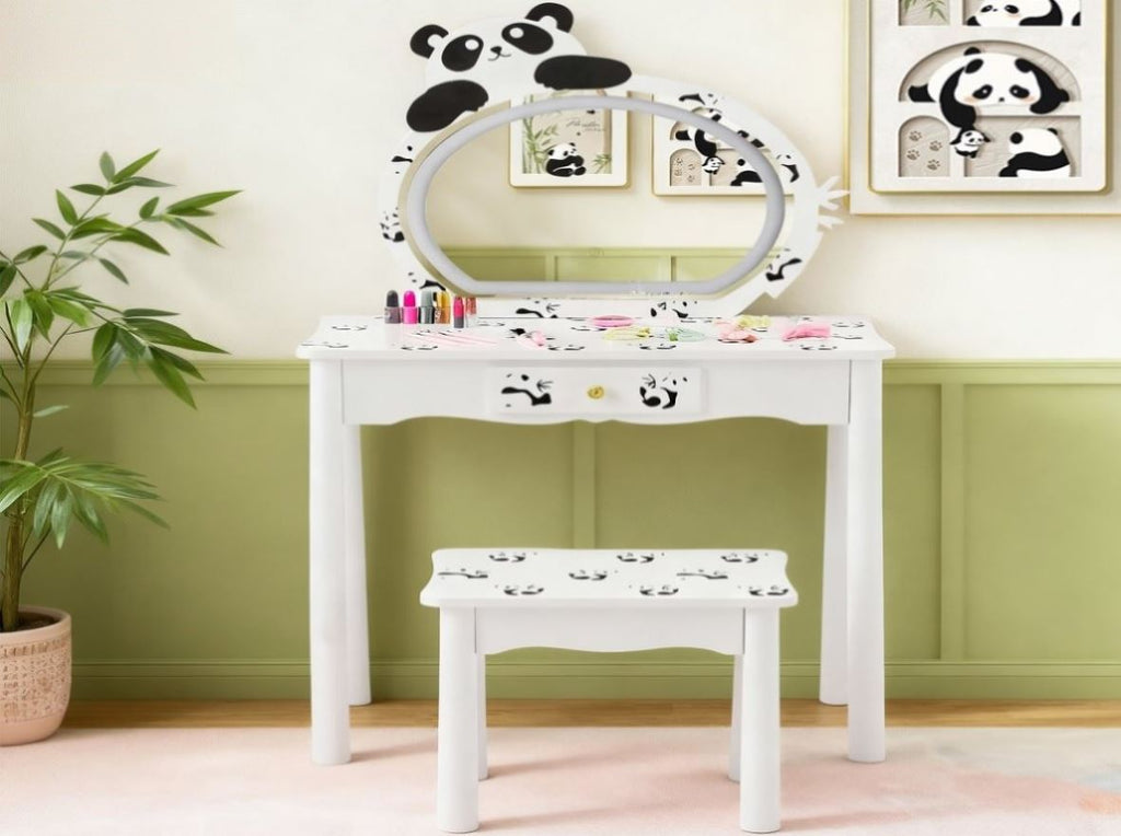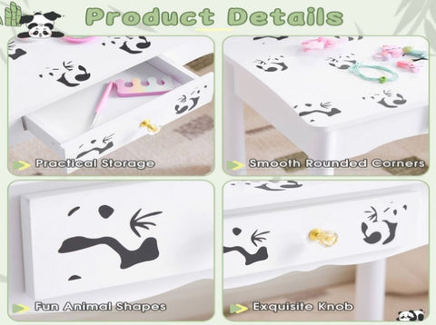 Enchanting Panda Theme Design This charming vanity set features an adorable black and white panda pattern that will capture your child's imagination. The playful design creates a fun, engaging space for creative play, helping develop personal organization habits in an enjoyable way. The high-quality printed artwork maintains its vibrant colors over time, making this vanity a delightful centerpiece in any child's room.