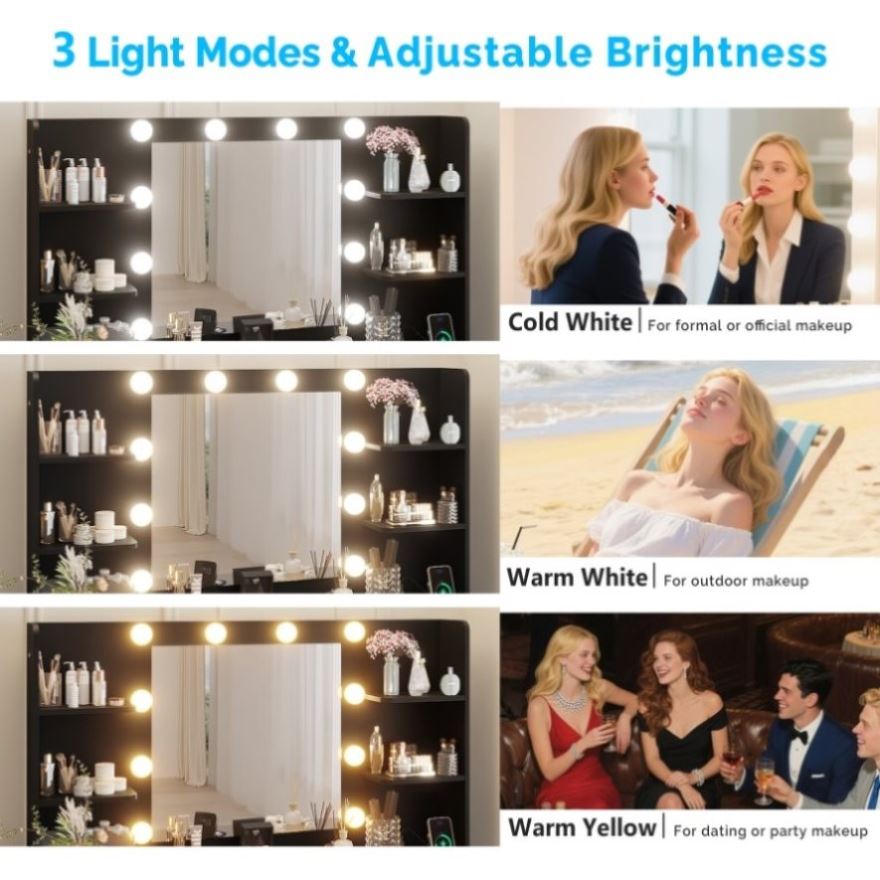 Transform your beauty routine with the advanced integrated lighting system featuring 10 energy-efficient LED bulbs. The innovative triple-color temperature design (warm 3000K, natural 4000K, and cool 6000K) allows you to customize lighting for different occasions and activities, from gentle morning preparation to precise evening makeup application. The dimmable function enables brightness adjustment from 10% to 100%, while the strategically positioned bulbs ensure even, shadow-free illumination across your entire face. The lights feature memory function, recalling your last setting, and operate with minimal energy consumption, making them both practical and economical for daily use.