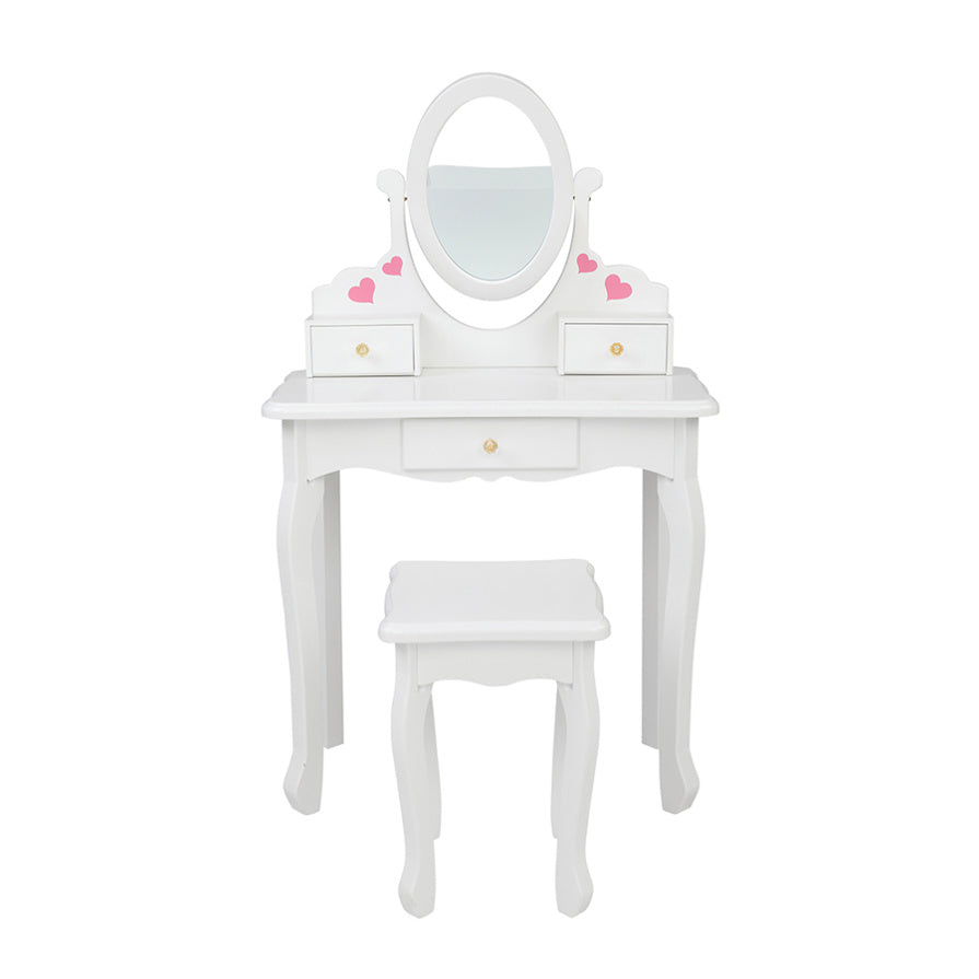 This is Children's Wooden Dressing Table. This dresser is made of high quality MDF board, which accentuates the super quality of the dressing table. White love style make this dresser sweet and lovely. The dresser top and stool surface all adopt arc design for avoid children knock against to cause unnecessary injury. What are you still hesitating? Hurry up and place an order!