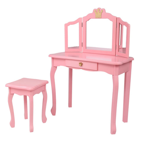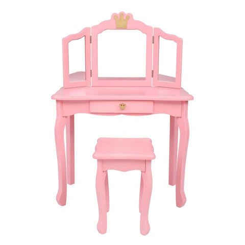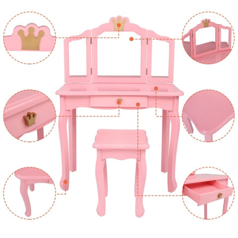 This is Children's Wooden Dressing Table. This dresser is made of high quality MDF board, which accentuates the super quality of the dressing table. Pink crown style make this dresser sweet and lovely. The dresser top and stool surface all adopt arc design for avoid children knock against to cause unnecessary injury. The three-fold mirror can be detachable and used as a children's desk.