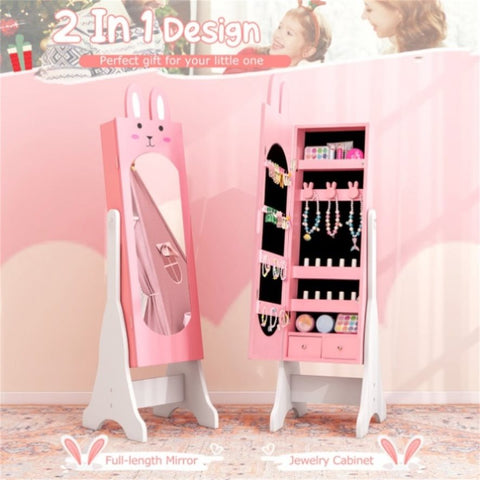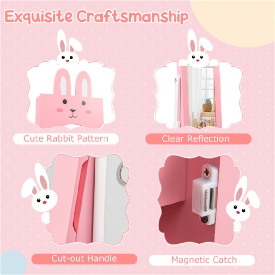 ● Multiple Storage Options: The vanity table includes 2 drawers and a shelf to store your kid's cosmetics, combs, hair clips or other small items. Moreover, the jewelry cabinet features 18 earring slots, 6 necklace and bracelet hooks, 4 storage shelves, 3 bunny bracelet rods and 2 small drawers to organize your child's precious jewelry neatly.