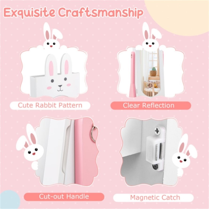 ● Multiple Storage Options: The vanity table includes 2 drawers and a shelf to store your kid's cosmetics, combs, hair clips or other small items. Moreover, the jewelry cabinet features 18 earring slots, 6 necklace and bracelet hooks, 4 storage shelves, 3 bunny bracelet rods and 2 small drawers to organize your child's precious jewelry neatly.