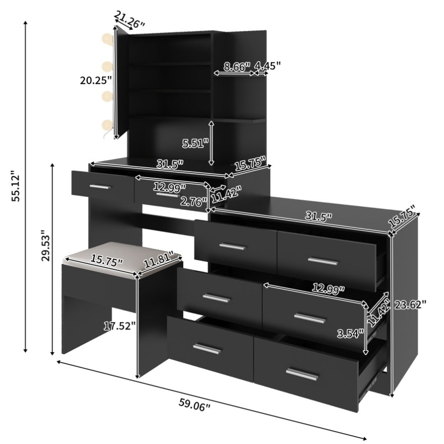 1. 2-in-1 Vanity and Dresser Combo: This multi-functional vanity combines the best of a makeup station and dresser, providing 3 storage shelves behind the mirror, 8 drawers, 3 tabletop shelves, and 2 staggered tabletops to keep all your makeup, skincare, and accessories neatly organized and easily accessible.
