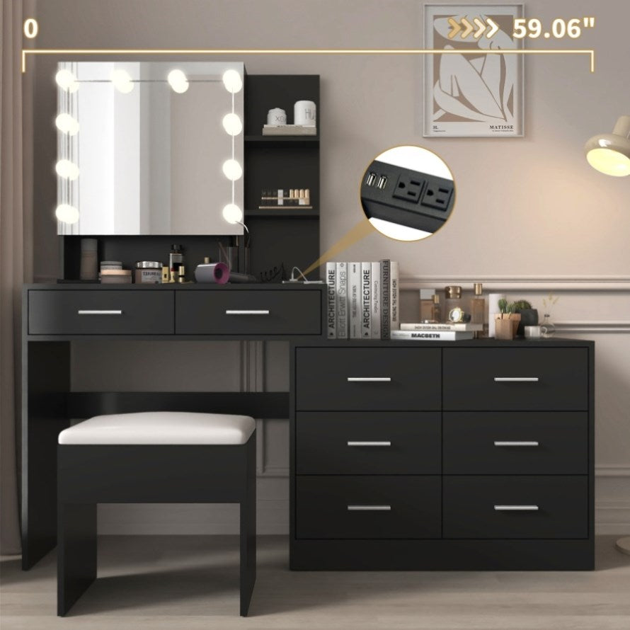 Elevate your bedroom with this stylish vanity and dresser combo that blends functionality with elegance. Designed to save space while providing ample room for your beauty essentials, this modern vanity offers the perfect place to get ready in style. With a sleek design, built-in mirror, and adjustable lighting, it meets all your needs for creating flawless looks, whether you're prepping for the day or getting ready for a night out. With a built-in charging station, you can conveniently charge your devices or power up your beauty tools right at your vanity.