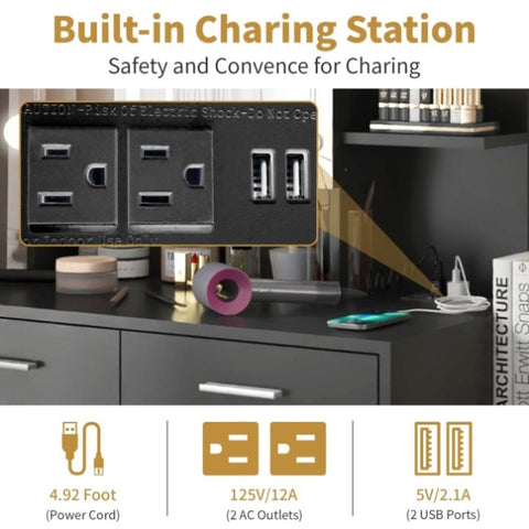 4. Built-in Charging Station: Equipped with 2 standard outlets and 2 USB ports, this vanity allows you to easily charge your phone, tablet, or plug in your hair tools, keeping everything within reach for a seamless beauty routine.