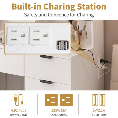 4. Convenient Charging Station with USB Ports: The built-in power strip includes 2 standard plug sockets and 2 USB ports, making it easy to charge your devices or use your hair dryer and curling iron while seated at your vanity.