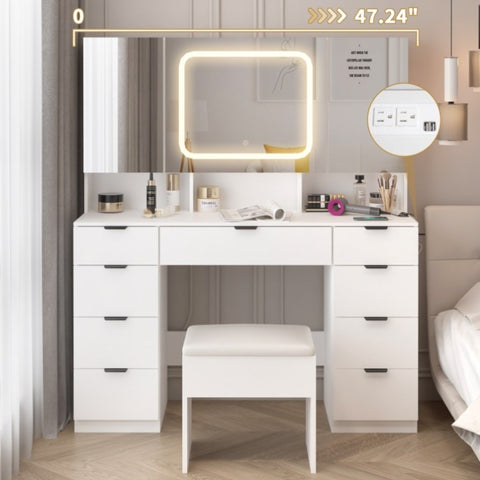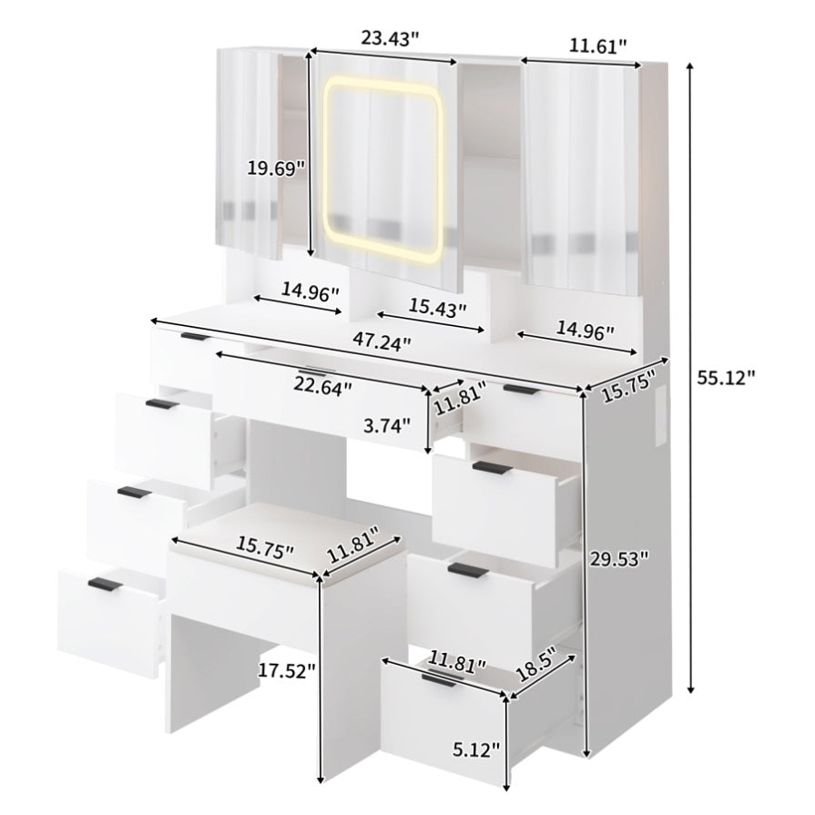 Transform your daily routine with this elegant and modern vanity table set. With a large, beautifully lit mirror that offers adjustable brightness and 3 lighting modes, this vanity creates the perfect setting for makeup application, skincare, or hairstyling. Behind the mirrors are 8 hidden storage shelves, offering plenty of space to keep your beauty essentials organized. Combining modern aesthetics with practical design, this vanity set adds a luxurious touch to your bedroom or dressing area, creating a personal space where you can feel pampered and inspired every day.