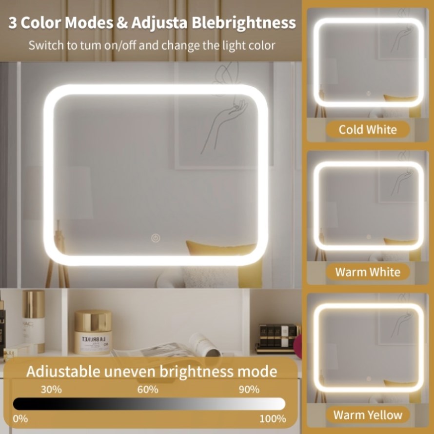 3. 3 Lighting Modes with Adjustable Brightness: The mirror features built-in LED light that offers 3 color lighting modes (warm, natural, cool) and adjustable brightness, ensuring the perfect lighting for any time of day or makeup look.
