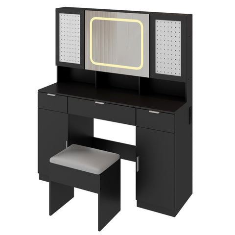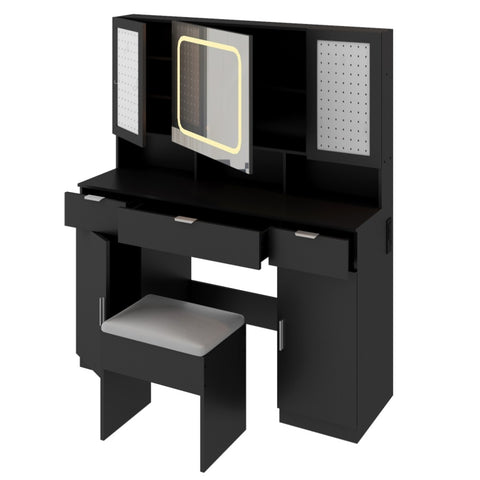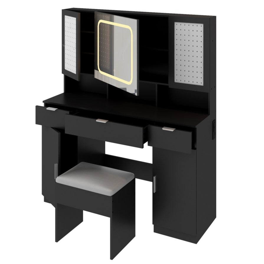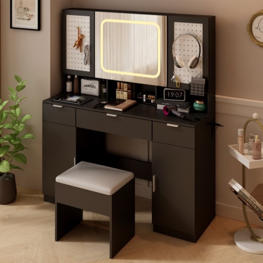 Transform your daily routine with this elegant and modern vanity table set. With a beautifully lit mirror that offers adjustable brightness and 3 lighting modes, this vanity creates the perfect setting for makeup application, skincare, or hairstyling. Storage shelves behind the mirror and two pegboards, together with 3 drawers and 2 cabinets, offer plenty of space to keep your beauty essentials organized. Combining modern aesthetics with practical design, this vanity set adds a luxurious touch to your bedroom or dressing area, creating a personal space where you can feel pampered and inspired every day.