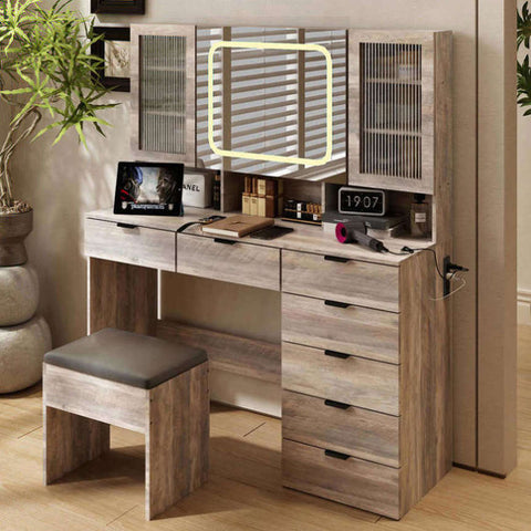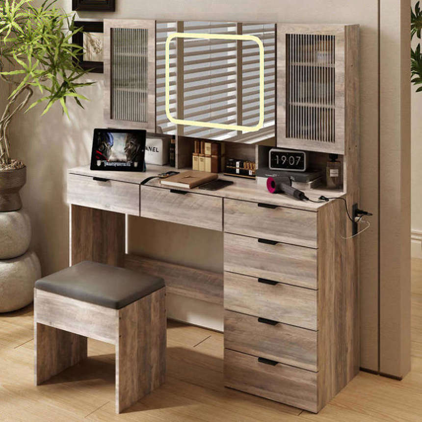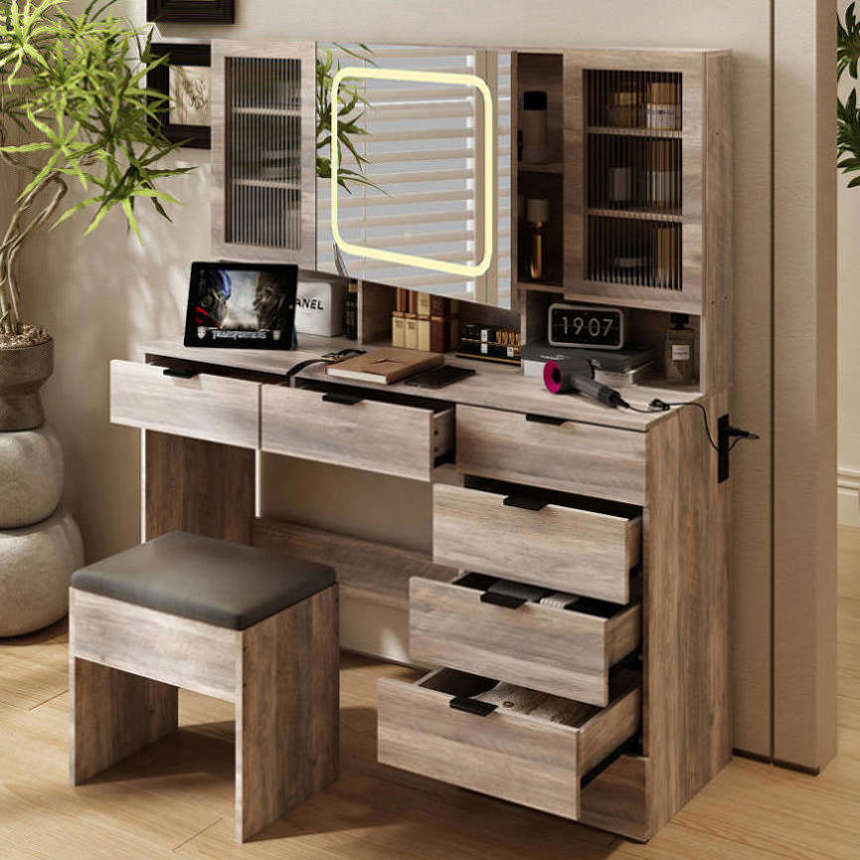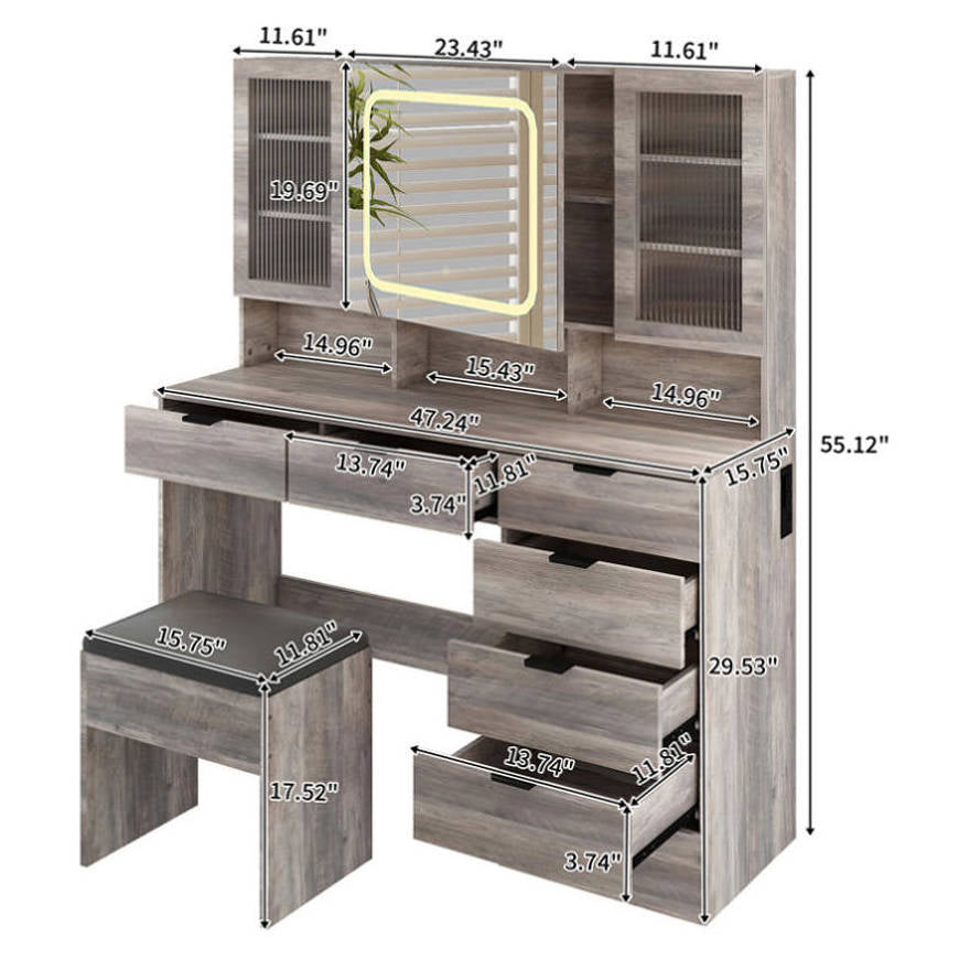 Transform your daily routine with this elegant and modern vanity table set. With a beautifully lit mirror that offers adjustable brightness and 3 lighting modes, this vanity creates the perfect setting for makeup application, skincare, or hairstyling. Storage shelves behind the mirror and two glass doors, together with 7 drawers, offer plenty of space to keep your beauty essentials organized. Combining modern aesthetics with practical design, this vanity set adds a luxurious touch to your bedroom or dressing area, creating a personal space where you can feel pampered and inspired every day.
