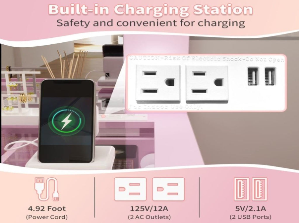 The vanity features a highly practical built-in power strip, conveniently located to plug in your hairdryer, curling iron, or other electronic devices right where you need them. The desktop is made of high-strength tempered glass, providing a smooth, durable, and easy-to-clean surface that resists stains and scratches. This combination of practical electricity access and a resilient work surface makes the vanity not only beautiful but also incredibly functional for your daily grooming and styling rituals.