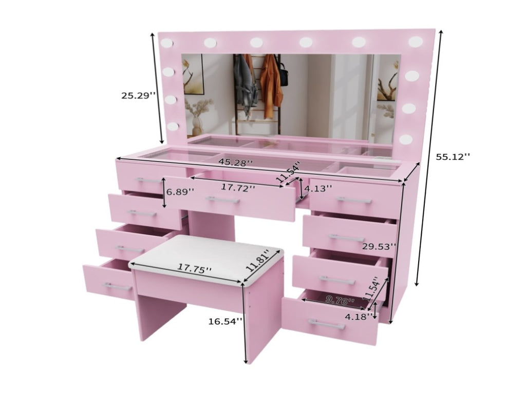 Say goodbye to clutter with the nine generously sized drawers included in this vanity set. They are designed to offer ample space for organizing all your beauty essentials, from foundations and lipsticks to hair tools and jewelry. The smooth-gliding mechanism ensures quiet and easy operation. This thoughtful storage solution allows you to keep your entire collection neatly stored yet instantly accessible, transforming your beauty routine into an efficient and enjoyable experience every single day.