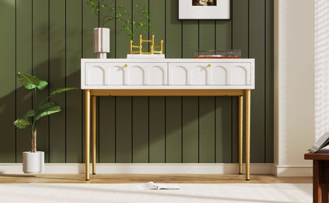 This modern metal leg double drawer dressing table combines elegant design with practical functionality, suitable for use in any bedroom, living room, or office. The simple and elegant appearance complements the sturdy metal leg support, showcasing both fashionable and practical charm. The double drawer design provides ample storage space, helping you easily organize cosmetics, accessories, and daily necessities, keep your desktop clean, and improve your quality of life.