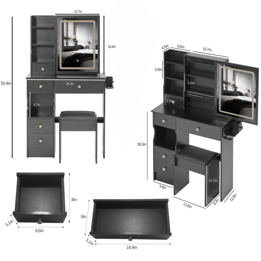 Introduction:  This product was designed by outstanding graduates from the renowned Parsons School of Design in New York, and has won an award in the American Fast Fashion Home Design Competition. It has been granted design patent protection in the United States. Certified by EPA, GCC, and UL.   Including:  1 x dressing table 1 x dressing stool 1 x Installation instructions