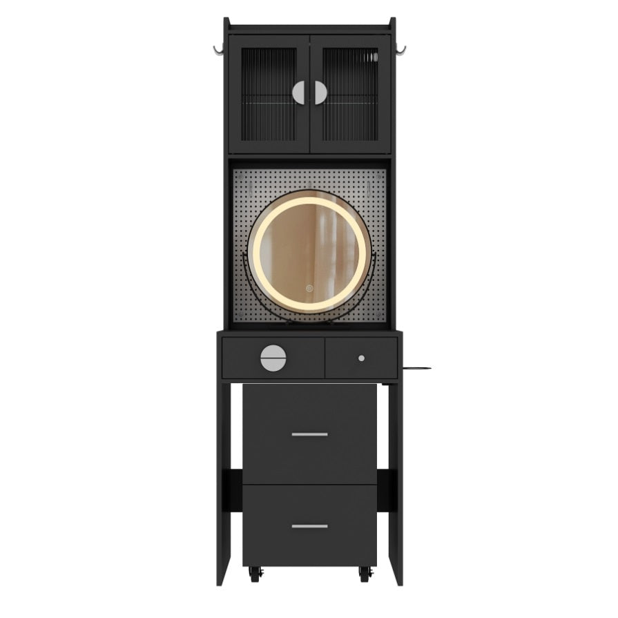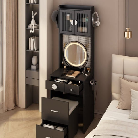 Transform your small space into a stylish and functional beauty station with this compact vanity desk set. Designed with space-saving features, it offers a clever combination of a large round mirror, ample storage, and a comfortable stool, perfect for small bedrooms or apartments. The sleek, modern design is enhanced by adjustable LED lighting and built-in charging stations, making your daily routine more convenient and enjoyable. Whether you're prepping for the day or winding down at night, this vanity set offers everything you need to create a clutter-free, elegant beauty corner.