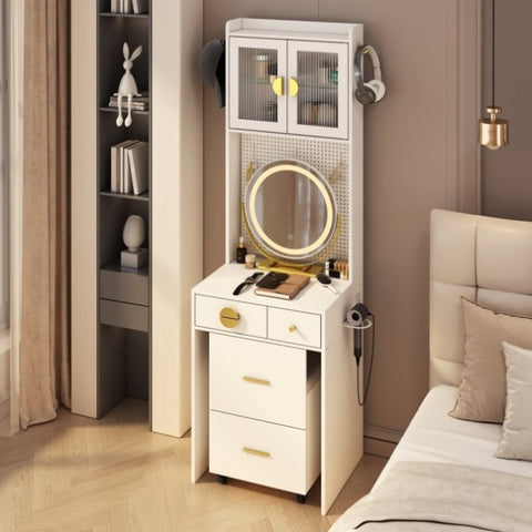 Transform your small space into a stylish and functional beauty station with this compact vanity desk set. Designed with space-saving features, it offers a clever combination of a large round mirror, ample storage, and a comfortable stool, perfect for small bedrooms or apartments. The sleek, modern design is enhanced by adjustable LED lighting and built-in charging stations, making your daily routine more convenient and enjoyable. Whether you're prepping for the day or winding down at night, this vanity set offers everything you need to create a clutter-free, elegant beauty corner.