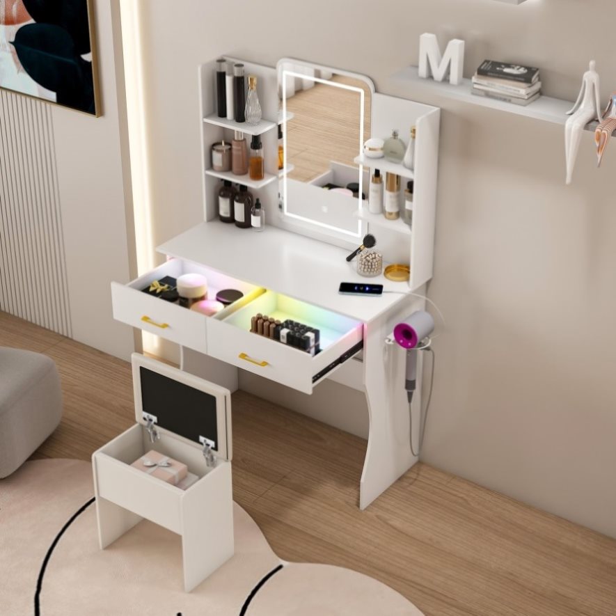 Smart RGB Ambient Lighting: The dressing table is equipped with an RGB lighting system beneath the tabletop. It can be controlled via the APP and buttons, featuring a variety of color and light effect modes, providing you with a thrilling audio-visual experience. Whether it's for relaxation or entertainment, you can fully immerse yourself in it.