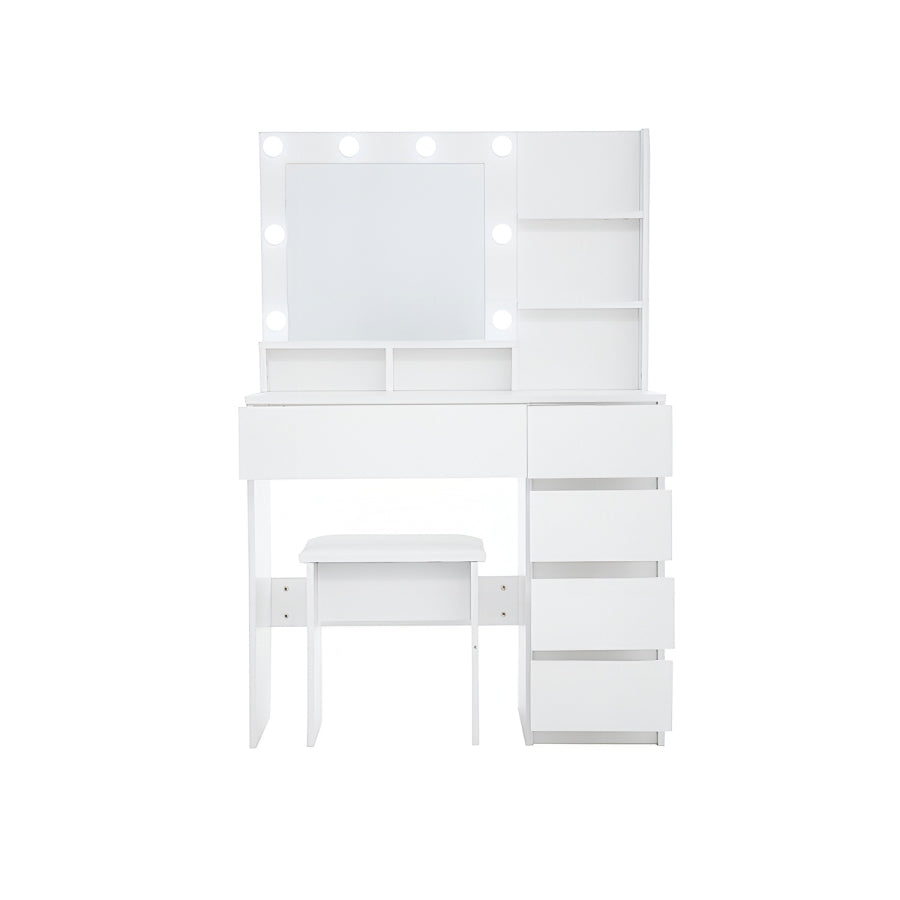 [Ample Storage Space] This thoughtfully sized vanity mirror with lights and table set (31.5”(L)*15.8”(W)*57.7”(H)) offers ample storage. With spacious drawers, three shelves, and an extra cushioned stool, you'll have enough room for all your makeup essentials, hair tools, jewelry, and lotions. Keep your desktop organized and clutter-free.