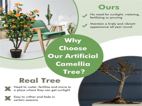 • Easy Maintenance: This artificial plant will maintain a lively appearance for years without wilting or fading due to seasonal changes.  Unlike real trees, it requires no pruning, watering, fertilizing, or sunlight, which will greatly free your hands, what’s more, this artificial camellia tree can easily be kept clean just with a wet cloth.