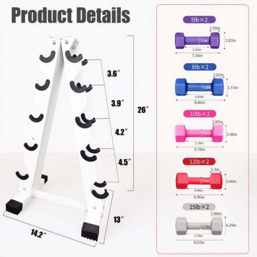 Includes a sturdy A-shaped rack + 5 pairs of neoprene & rubber-coated dumbbells (5lb, 8lb, 10lb, 12lb, 15lb). Space-saving design with non-slip base, perfect for organizing home gyms, apartments, or small spaces.